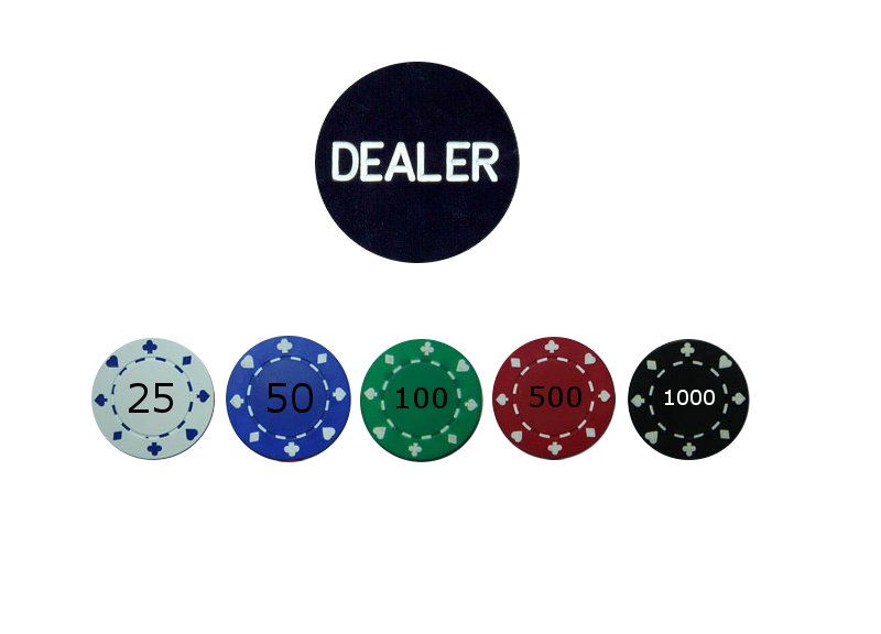 At the begining each player is given a stack of chips to bet with. Each chip has a set vaule as shown in the picture below